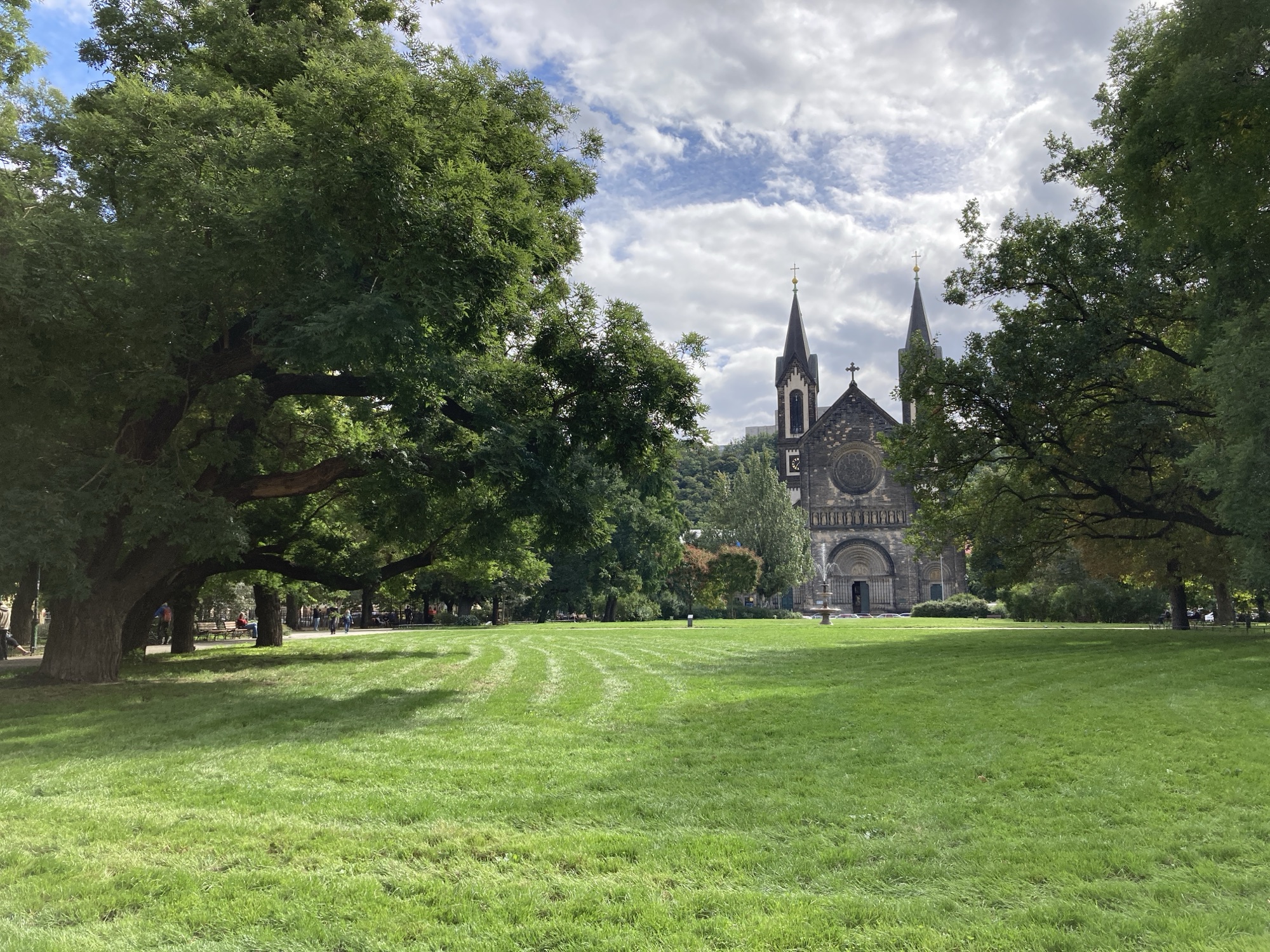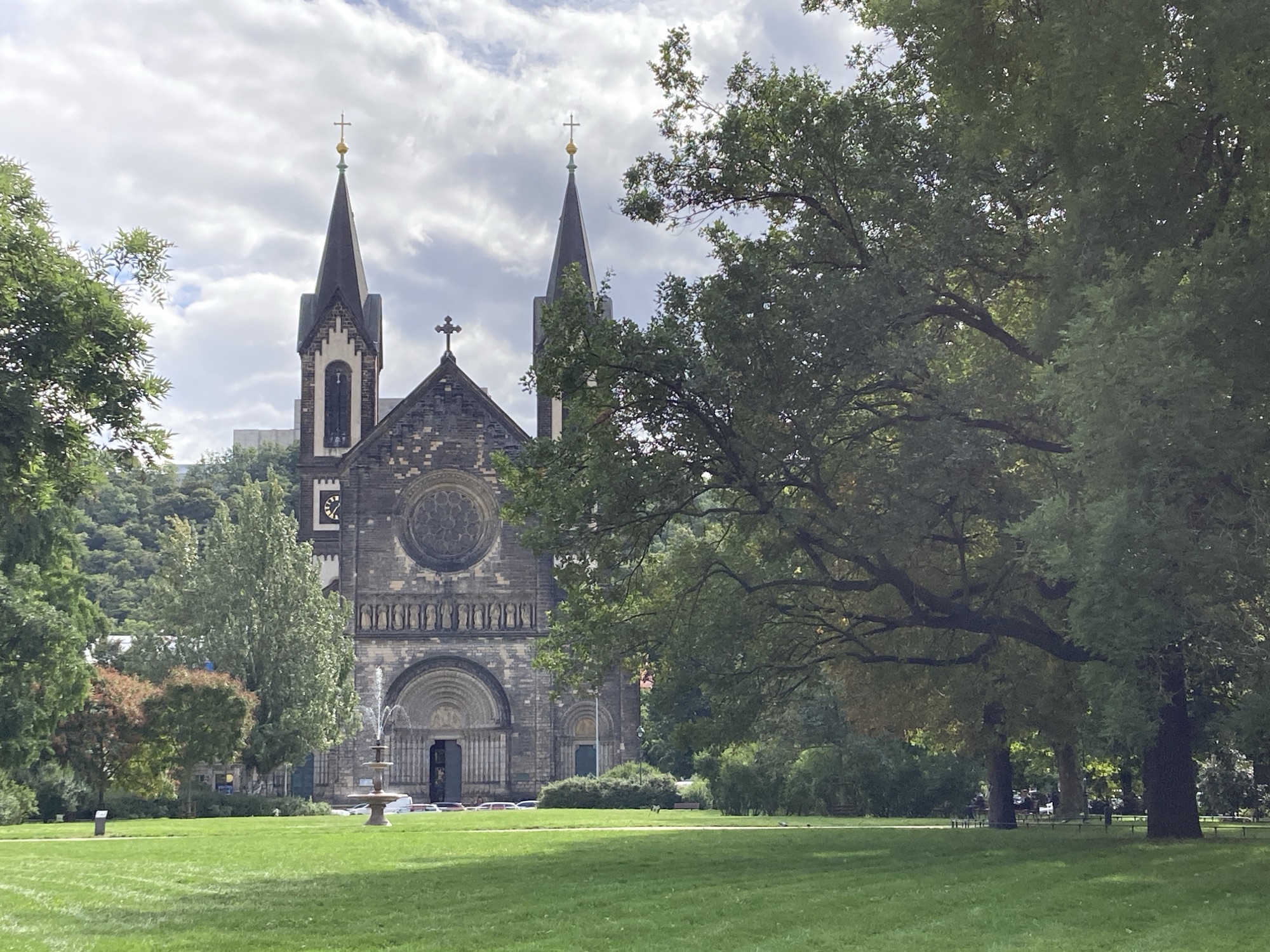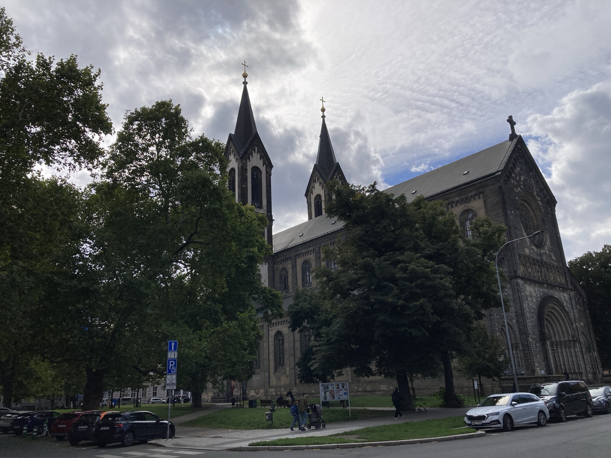 Die Kirche St. Cyrill und Method (Kostel sv. Cyrila a Metoděje) ist das markante Wahrzeichen des Prager Stadtteils Karlín. Mit ihren zwei 78 Meter hohen Türmen, der monumentalen Fassade und dem weitläufigen Kirchenschiff zählt sie zu den bedeutendsten Sakralbauten des 19. Jahrhunderts in Böhmen. Sie steht auf dem Karlínské náměstí, dem zentralen Platz des Viertels, und prägt das Stadtbild mit ihrer kraftvollen, neoromanischen Architektur.