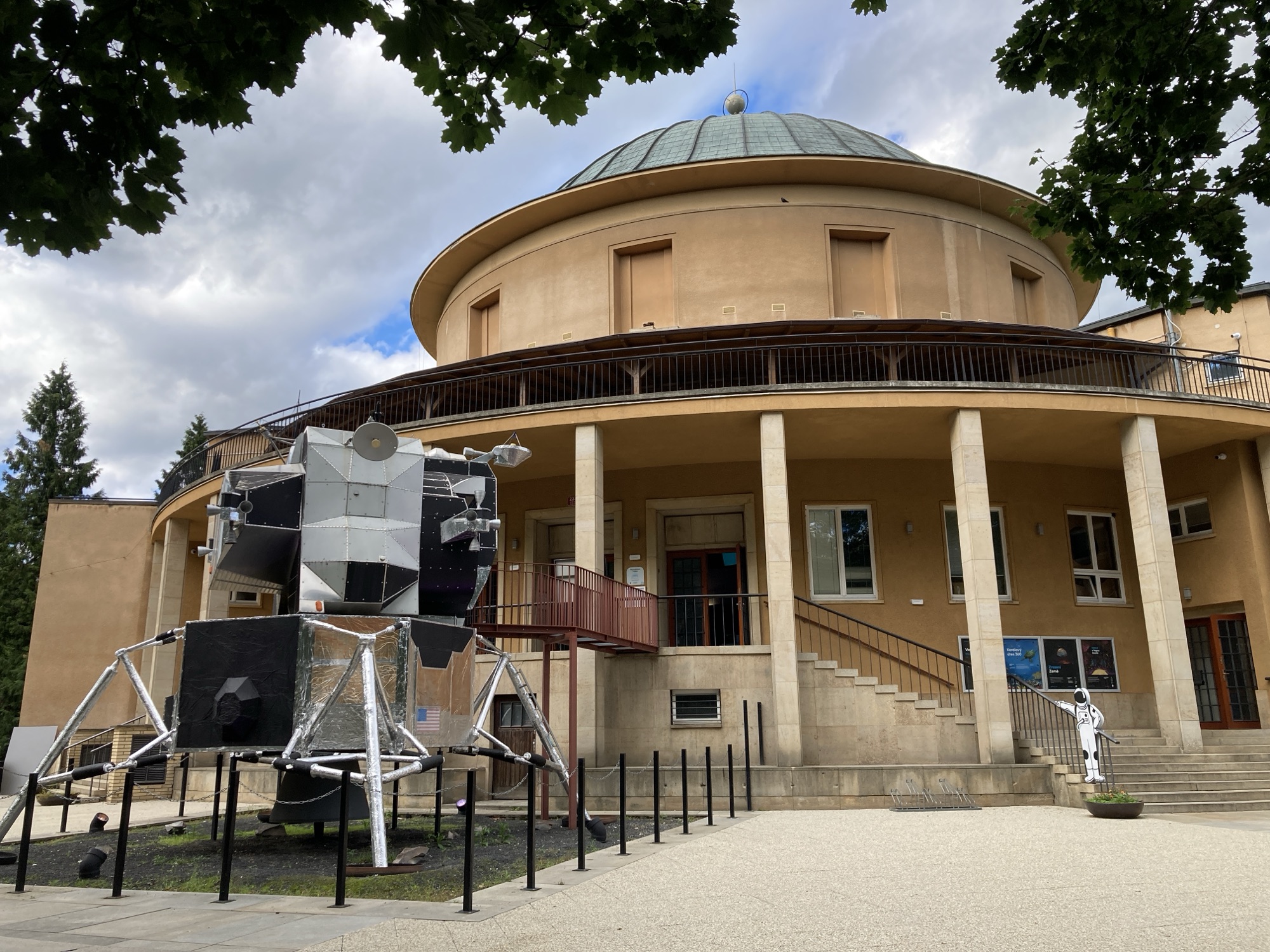 Das Planetarium Prag befindet sich in Bubeneč (Prag 7), direkt am Stromovka-Park (Königlicher Wildpark) neben dem Ausstellungsgelände Výstaviště Praha. Schon von außen macht das Gebäude Eindruck: Vor dem Eingang steht ein riesiges Modell der Apollo-11-Mondlandefähre „Eagle“ in Originalgröße, das sofort auf das Thema einstimmt. Die Lage im Grünen ist idyllisch – perfekt für einen anschließenden Spaziergang im Park. Dennoch bist du nah am Stadtzentrum: Mit der Straßenbahn (Linien 6, 12 oder 17) erreichst du das Planetarium bequem über die Haltestelle Výstaviště Holešovice in wenigen Minuten vom Zentrum aus. Auch von der Metrostation Nádraží Holešovice (Linie C) sind es nur zwei Tramstationen bis dorthin.