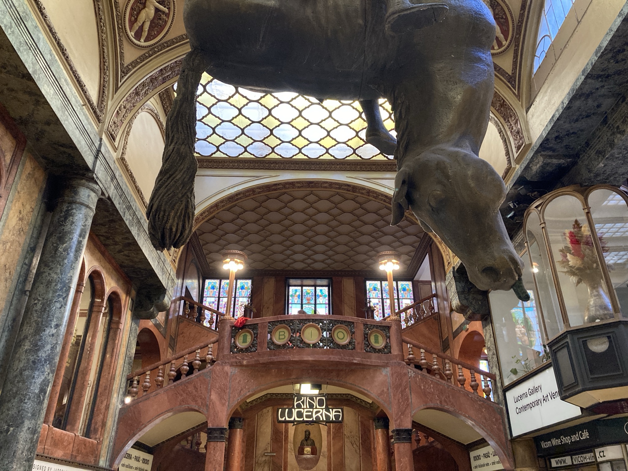 Im Eingangsbereich des Palasts hängt das berühmte Kunstwerk des Bildhauers David Černý: das umgekehrte Pferd, auf dem der „tote König Wenzel“ sitzt – eine satirische Interpretation des nationalen Helden. Gleich dahinter öffnet sich das Foyer des Kinos, das mit seinem goldenen Licht, den alten Kinoplakaten und der gedämpften Stimmung wie eine Zeitmaschine wirkt.