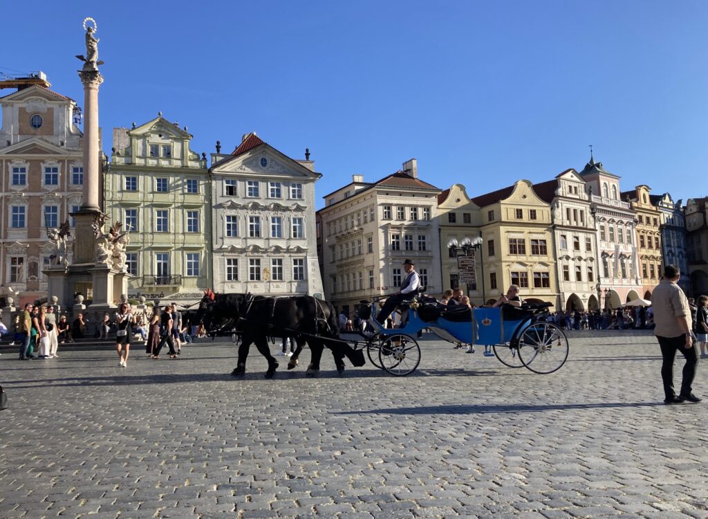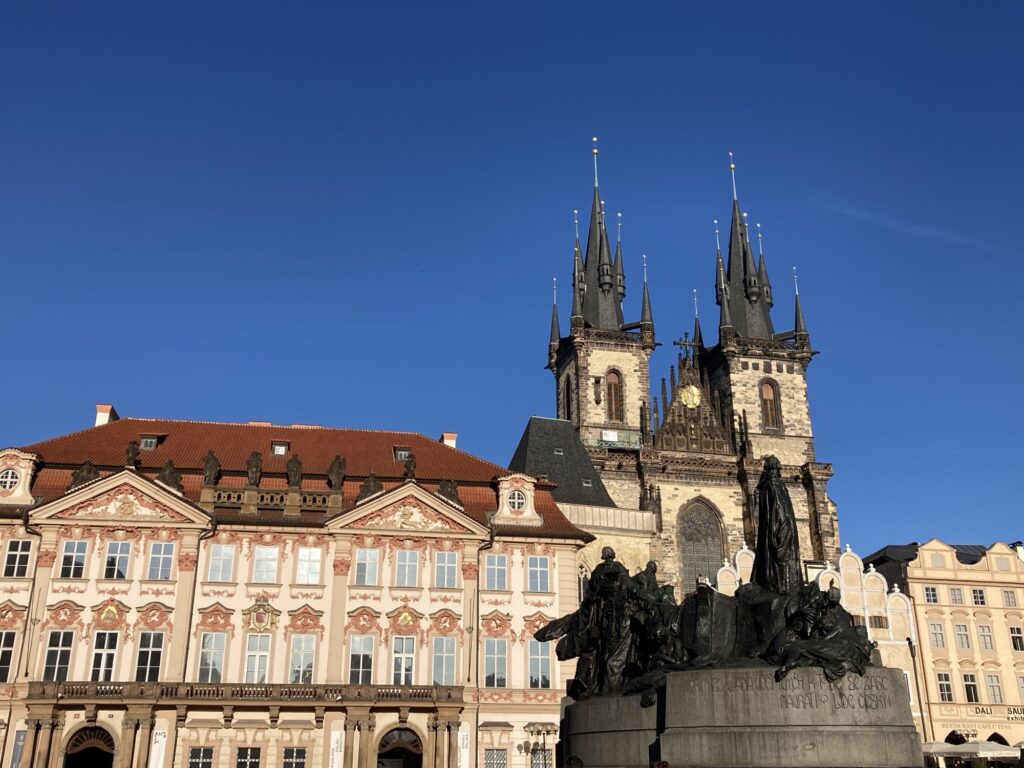 Zwischen den Gebäuden findet man außerdem das Jan-Hus-Denkmal (Mitte des Platzes) sowie die Mariensäule (vor dem Portal der Teynkirche) – beide erinnern an wichtige Momente der tschechischen Geschichte (siehe unten).